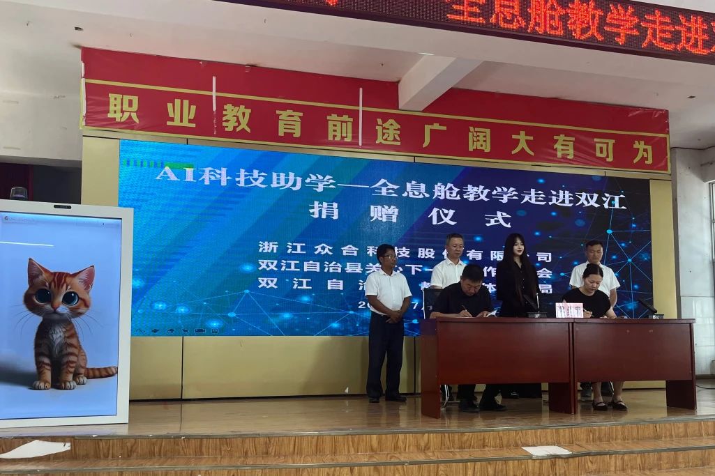 7月初,當(dāng)臨滄市委書記杜建輝率團(tuán)考察眾合科技時(shí),雙江自治縣便與眾合科技達(dá)成了戰(zhàn)略合作,雙方約定在科技助學(xué)、科技助農(nóng)、自然資源保護(hù)開發(fā)及茶產(chǎn)業(yè)數(shù)字化等領(lǐng)域展開深度合作?;谶@一合作共識(shí),今日,云南省臨滄市雙江自治縣職業(yè)教育中心報(bào)告廳內(nèi),“AI科技助學(xué)——全息艙教學(xué)走進(jìn)雙江”捐贈(zèng)儀式溫暖啟幕。這不僅是眾合科技ESG行動(dòng)計(jì)劃的又一次重要實(shí)踐,更為雙江自治縣的教育與農(nóng)業(yè)發(fā)展注入了新的科技動(dòng)能。